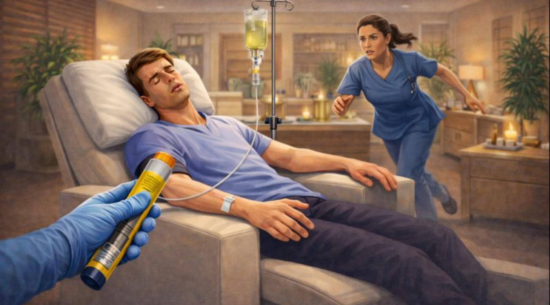 A young and generally healthy man was feeling run down, so he went to a wellness spa to receive an IV vitamin infusion. Shortly after the IV was hooked to his arm and the infusion began, he felt like he was blacking out.